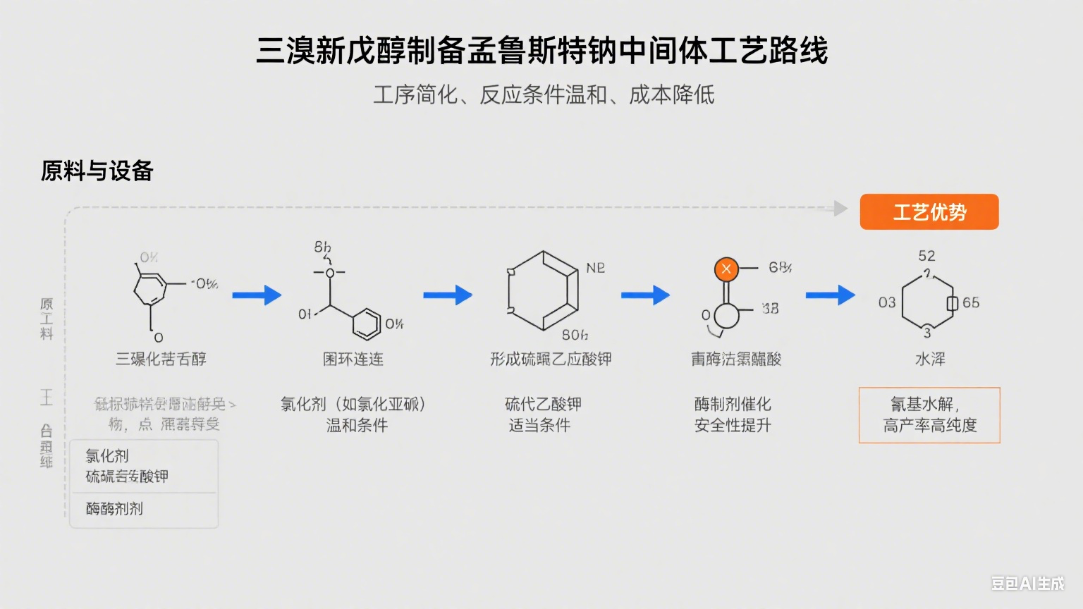 孟魯斯特鈉(Montelukast Sodium)是一種用于治 療哮 喘和過(guò)敏性鼻炎的有 效**,其中間體的制備對其** 終產(chǎn)物的質(zhì)量和生產(chǎn)成本具有重要影響。本文介紹了一種通過(guò)三溴新戊醇合成孟魯斯特鈉中間體的工藝方法。與傳統方法相比,該工藝具有工序簡(jiǎn)化、反應條件溫和、原料成本降低等優(yōu)點(diǎn),為孟魯斯特鈉的工業(yè)化生產(chǎn)提供了一條高 效、經(jīng)濟的路線(xiàn)。